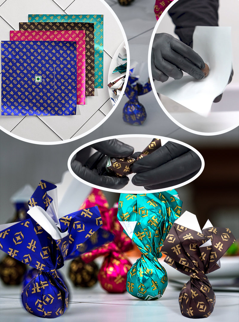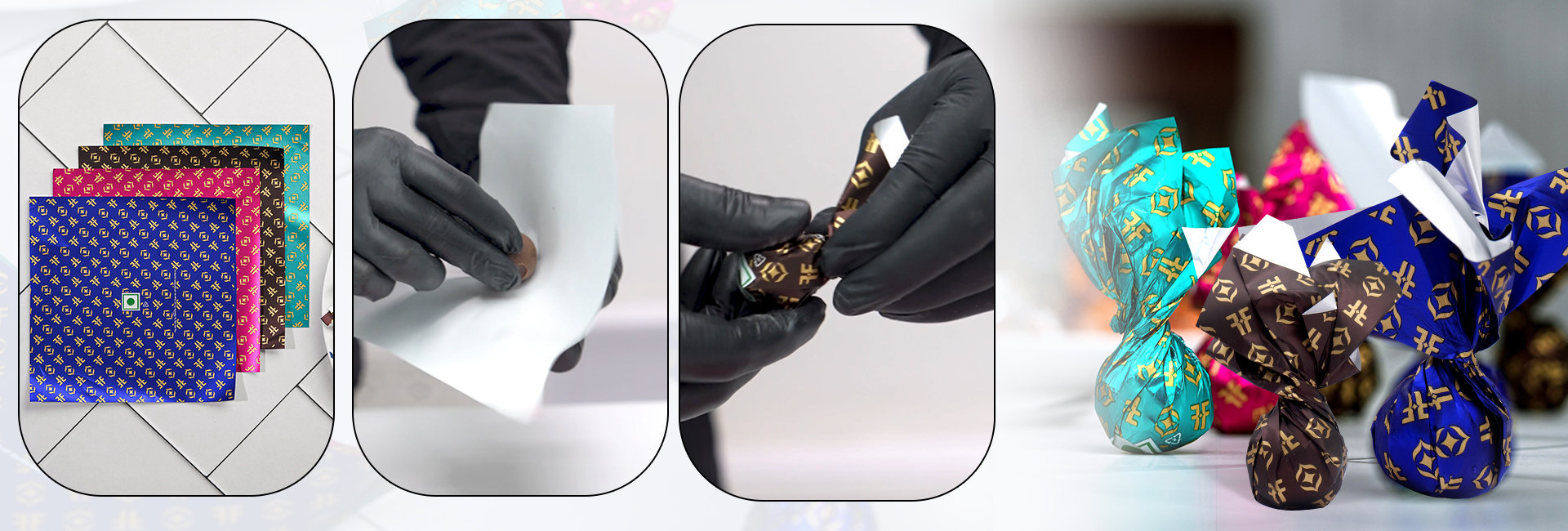 Pearlised Chocolate Sheets is a delightful and practical way to encase delectable chocolates in an eye-catching package. This technique involves folding a high-quality sheet around each chocolate piece and then twisting the ends to secure the package. It not only ensures the chocolates remain fresh and protected but also adds a touch of elegance to the overall presentation.